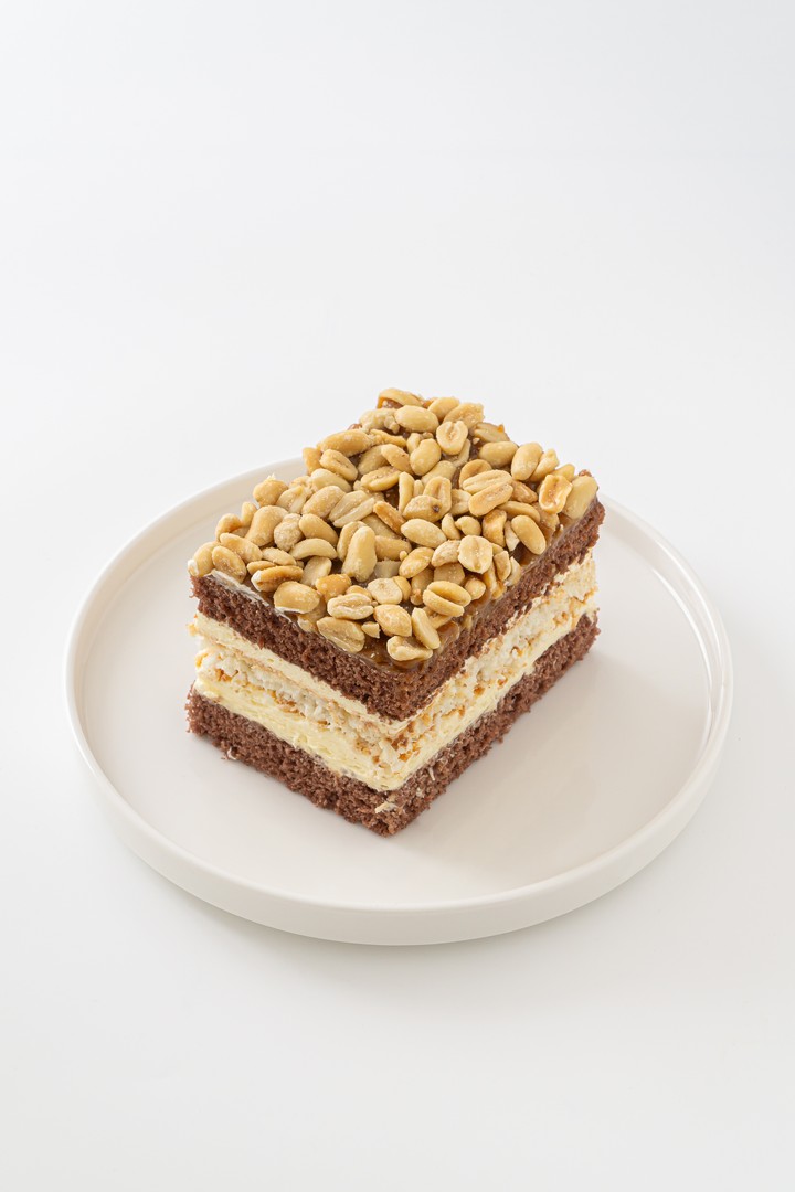 Ciemny biszkopt z kremem orzechowym, przełożony ciastem kokosowym, a całość posypana orzechami to połączenie intensywnego smaku i chrupkości. Nuty orzechowe i karmel doskonale współgrają z biszkoptem, tworząc niezapomnianą symfonię smaków.