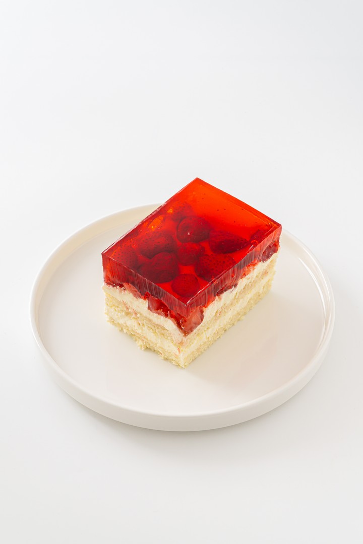 Jasny biszkopt z bitą śmietaną truskawkową i galaretką owocową, udekorowany świeżymi truskawkami, tworzy wyjątkową symfonię smaku. Nasze ciasto jest pełne kontrastów, gdzie delikatność biszkoptu jest perfekcyjnie zrównoważona soczystością truskawek i słodyczą galaretki. Każdy kęs to prawdziwy taniec smaków, który dostarcza niezapomnianych doznań.
