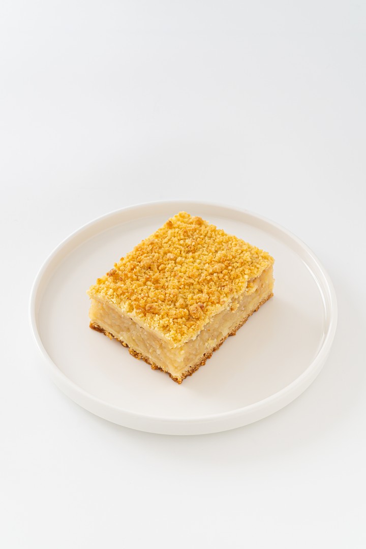 Całość jest posypana kruszonką, która nadaje ciastu dodatkowej tekstury i smaku. To połączenie tradycji i prostoty, które przypomina o domowym cieple i smaku dzieciństwa.
