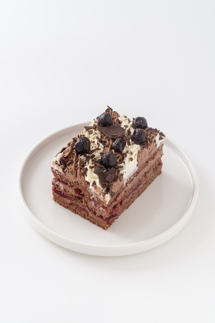 Puszyste ciasto ciemne biszkoptowe, przełożone kremem czekoladowym, nadzieniem wiśniowym, wykończone bitą śmietaną i wiśniami w żelu